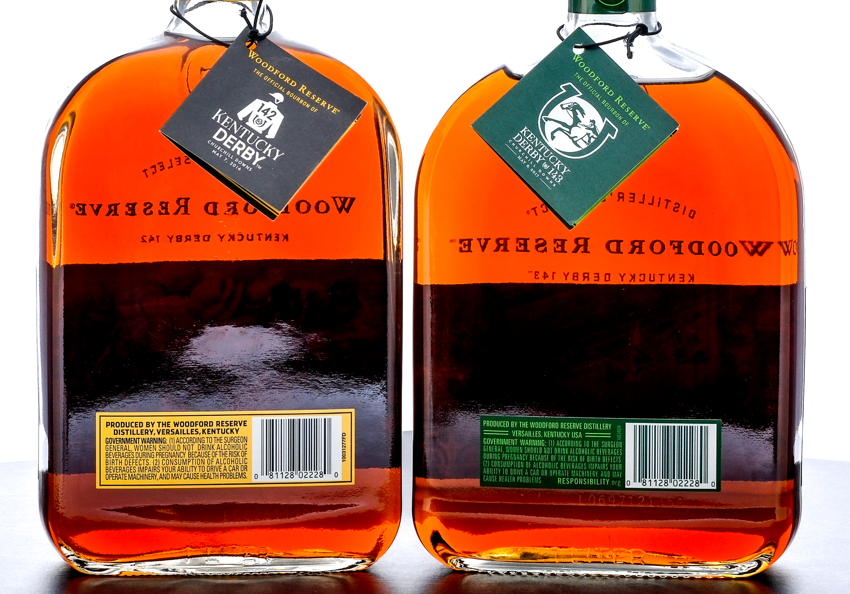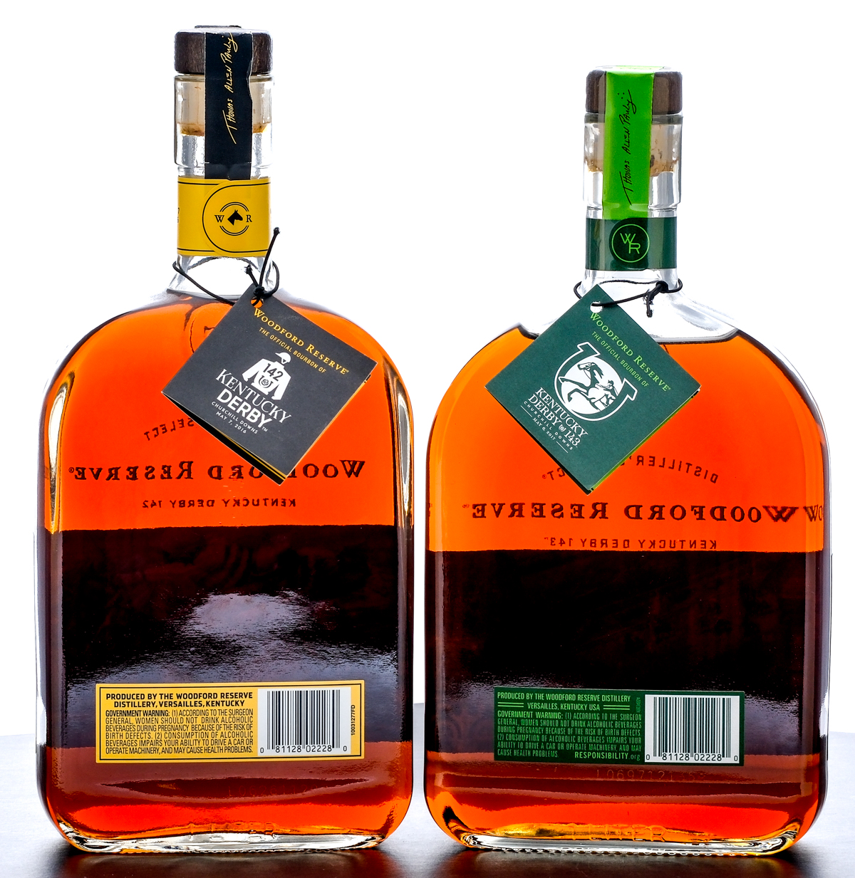 Woodford Reserve Distiller’s Select Kentucky Straight Bourbon, Kentucky Derby Two Bottle Group 1x Bottle: Commemorating the 142nd running of the Kentucky Derby (May 7 , 2016). 45.2% ALC/VOL (90.4 Proof). Stamp seal and hang tag intact. Screened and printed labels excellent. 1L 1x Bottle: Commemorating the 143rd running of the Kentucky Derby (May 6, 2017). 45.2% ALC/VOL (90.4 Proof). Plastic and stamp seal intact. Hang tag intact. Screened and printed labels excellent. 1L Produced by the Woodford Reserve Distillery, Versailles, Kentucky USA.